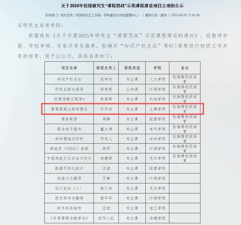 2.培育示范课程:组织教师申报校级“课程思政”示范课程,许开成教授《高等混凝土结构理论》获批立项并获培育资助。王永祥教授主持的《工程经济学》成功获批“国家级一流本科课程(线上)”,为全院课程建设树立标杆。