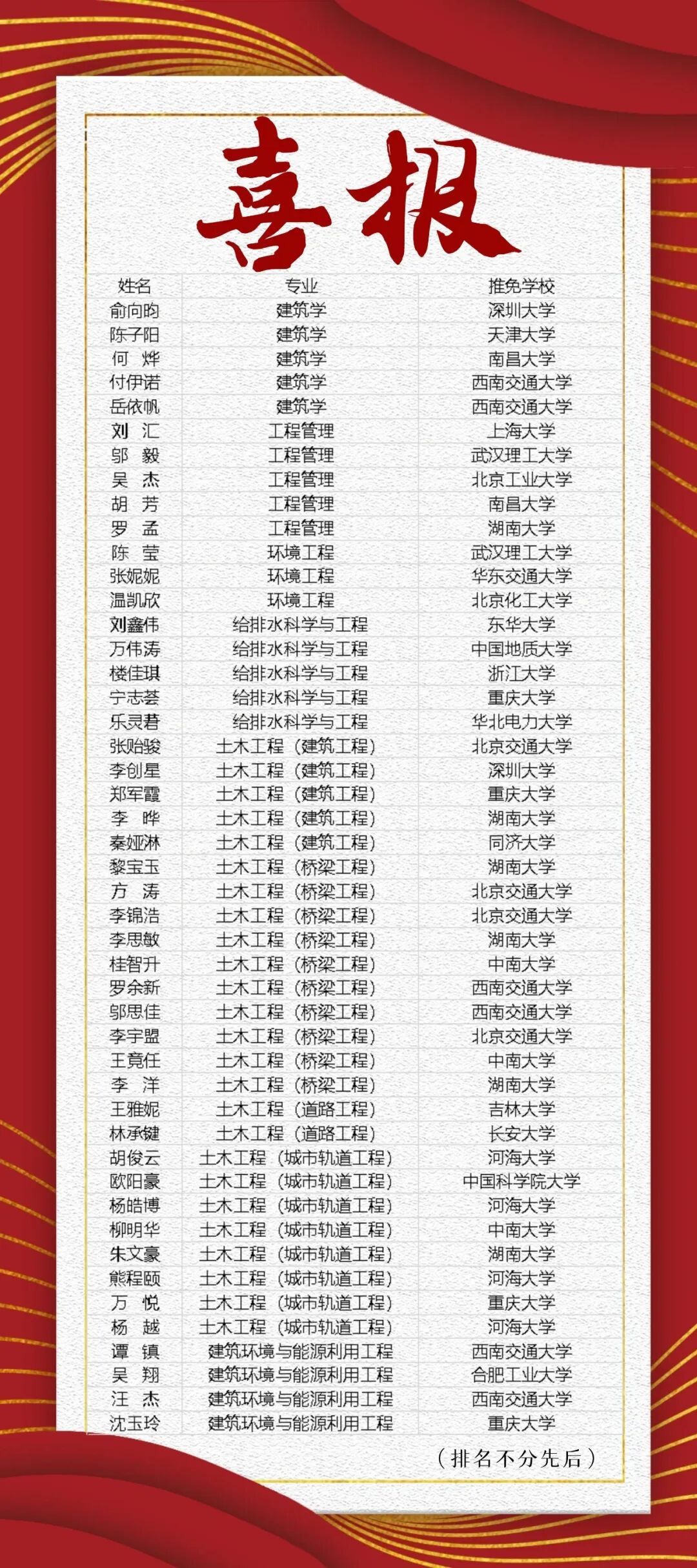 金秋时节,硕果盈枝!华东交通大学土木建筑学院2026届本科生推荐免试攻读硕士研究生工作再传捷报,共有47名优秀学子成功获得推免资格,录取结果喜人。在此,谨向所有顺利保研的同学表示最热烈的祝贺!并向辛勤培育的全体老师致以最诚挚的感谢!