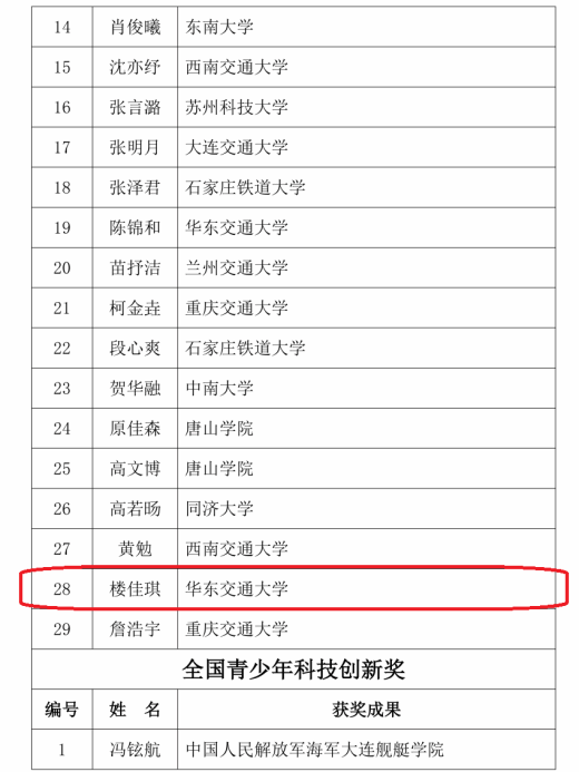 楼佳琪,中共预备党员,2020年考入华东交通大学,同年9月服役于中国人民解放军火箭军。从火箭军战士到本科生,再以全院综合推免成绩第一保研至浙江大学,他以全面发展践行“请党放心,强国有我”的青春誓言。期间,获国家级奖项7项,省部级奖项7项,申请国家专利7项。(楼佳琪同学的主要事迹和奖项荣誉见华交土木年华微信公众号2025年12月21日的推送:本科生国奖风采 | 楼佳琪:行远自迩,笃行不怠)