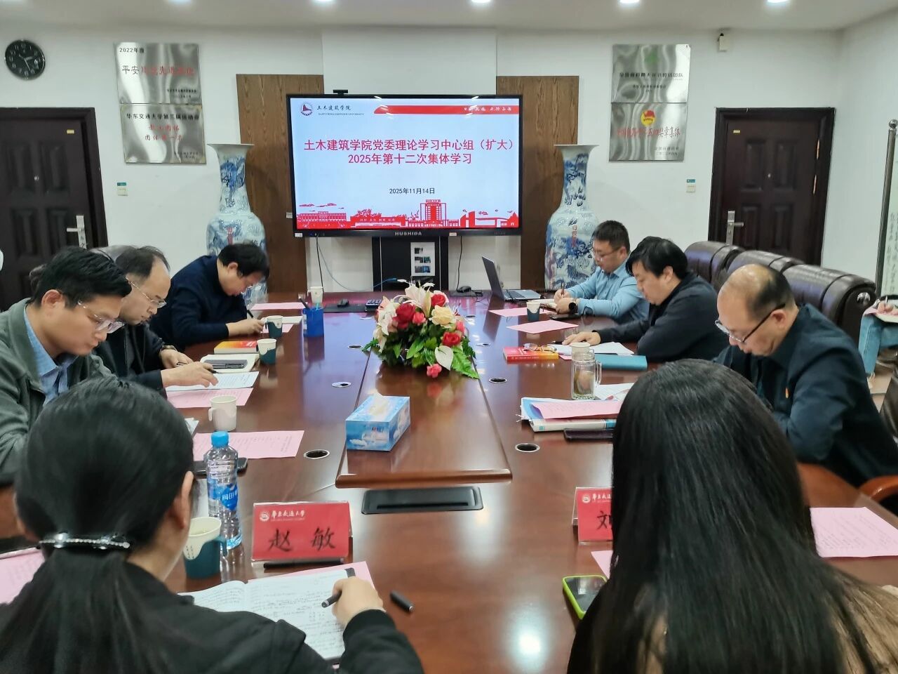 为深入学习贯彻党的二十届四中全会精神,准确把握党中央对新时代新征程党和国家事业发展的新部署、新要求,切实把思想和行动统一到党中央决策部署上来,11月14日,土木建筑学院党委理论学习中心组举行2025年第十二次集体(扩大)学习会,专题学习党的二十届四中全会精神,会议由院长庄海洋主持,院党委委员、院班子成员、各党支部书记参加会议,电气学院党委书记赵敏、党委组织员刘佳列席旁听。