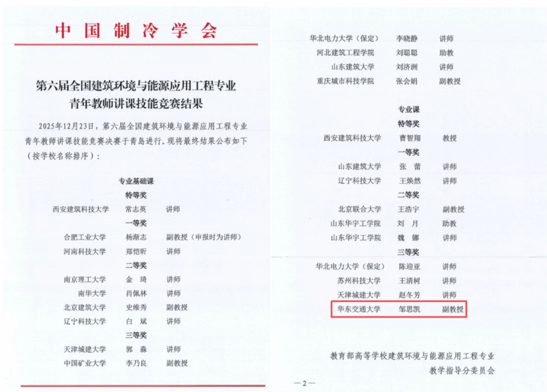 近日,第六届全国建筑环境与能源应用工程专业青年教师讲课技能竞赛决赛在青岛圆满完成。本届竞赛共有来自全国29所院校的38位教师报名参赛,其中专业基础课21人,专业课17人。经过激烈角逐,我院教师邹思凯荣获三等奖,这是我院能环系教师首次获得该项奖励。