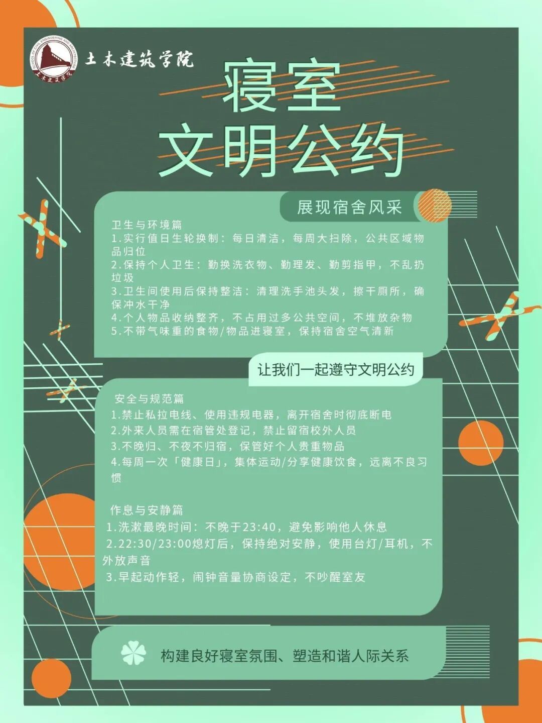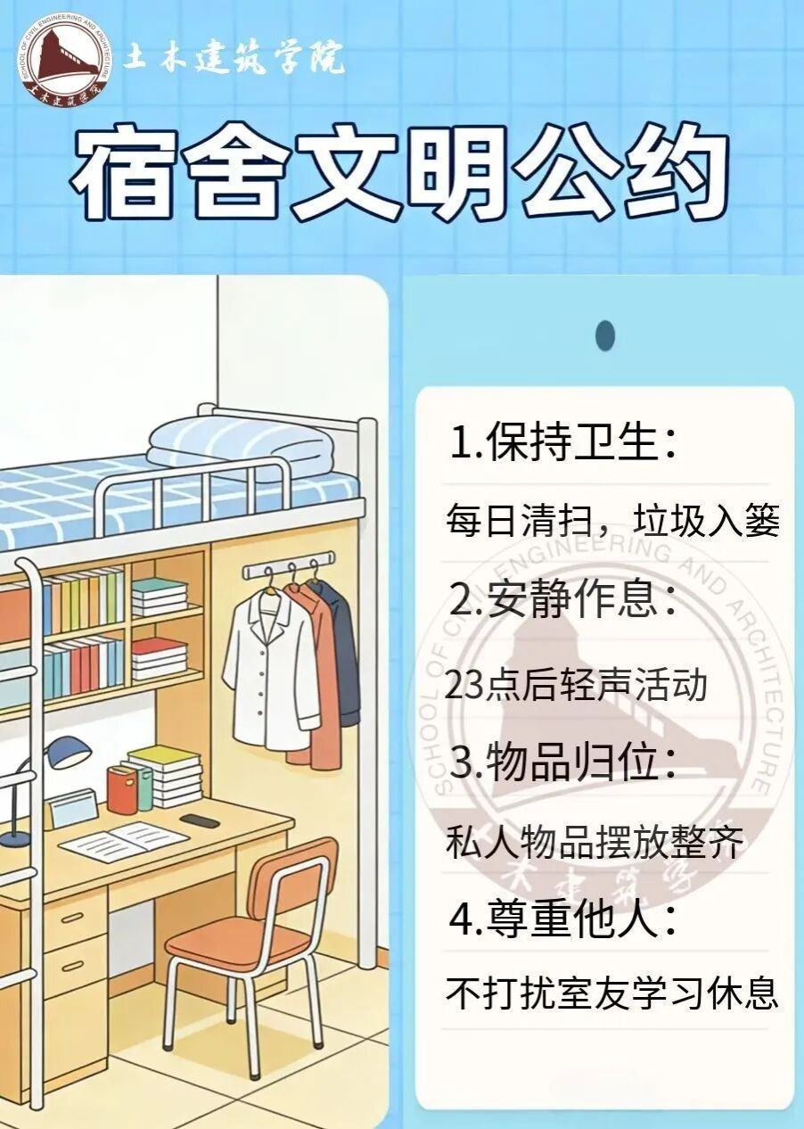 为让宿舍文明建设有章可循、有规可依,学院统一制定并印发涵盖卫生环境、安全规范、作息安静、人际和谐四大板块的《土木建筑学院寝室文明公约》。公约详细明确了值日清扫标准、物品归位要求、用电安全规范、熄灯静音约定以及禁止使用违规电器等具体内容,以制度化方式推动行为养成。